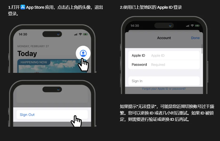 在apple store退出原来的apple id (注意不是从设置里退出apple id,参考下面图中,点击滑到页面最后,点击退出),登录购买的非国区apple id