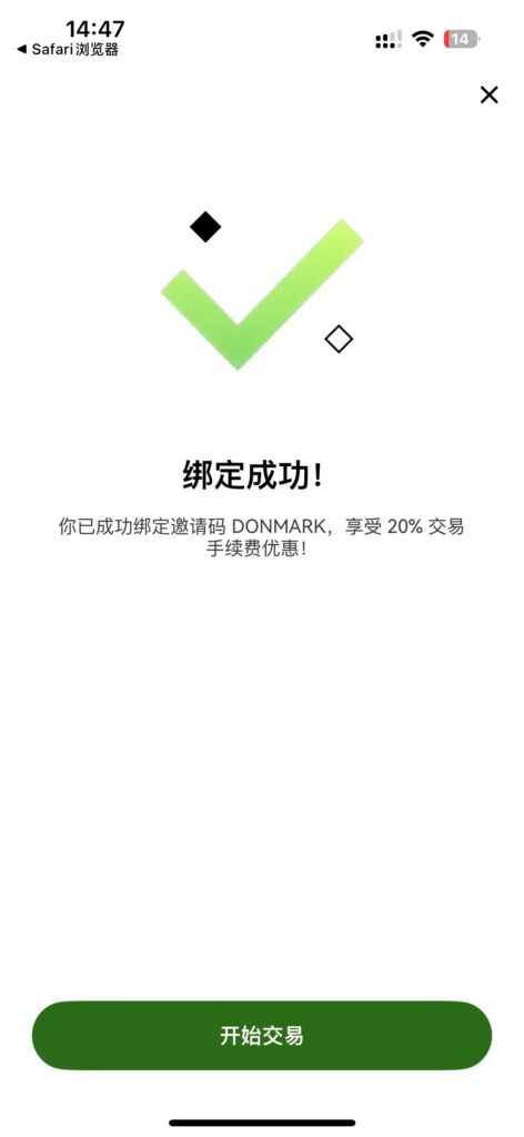 当然,链上交易是需要付出手续费的,手续费在打狗中能否盈利是起到了重要作用,所以是否能减免手续费是重中之重,这里将教会你如何帮你把你的手续费降到最低!如果你的网络可以支持科学上网的话,你可以通过点击下面的链接直接注册或者跳转绑定,如果你网络不支持科学上网也是可以通过手动输入邀请码来减免手续费!
