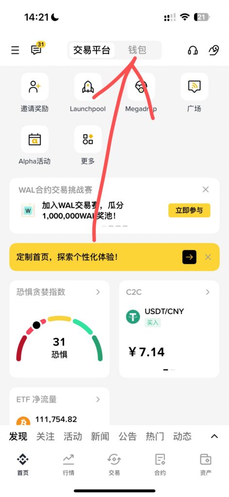 第一步、在币安账户主页面上方点击“钱包”,按照流程创建钱包