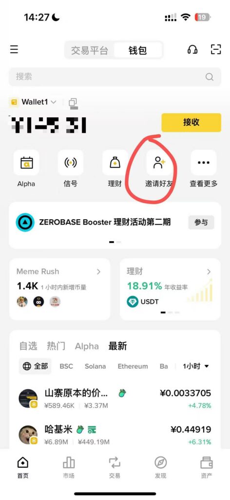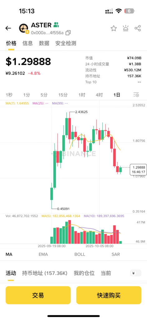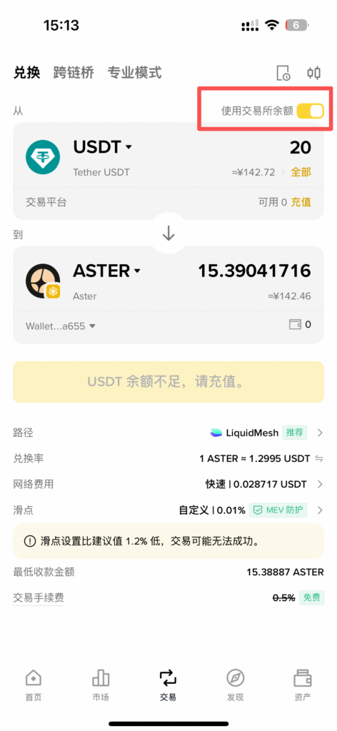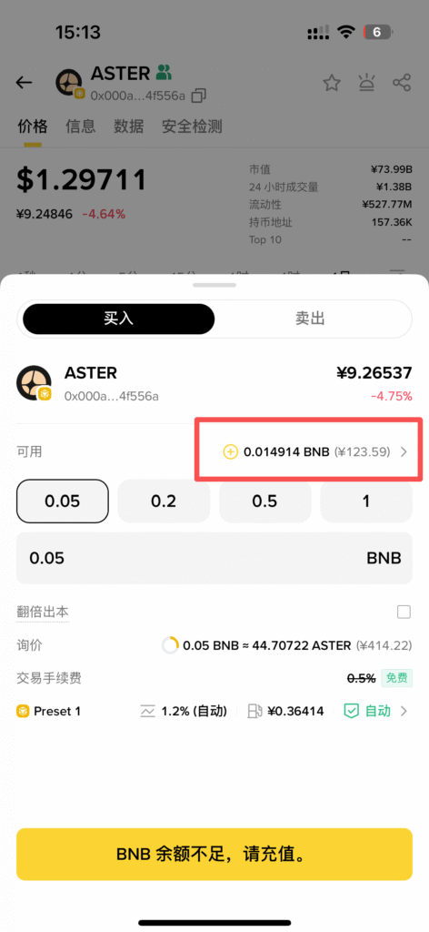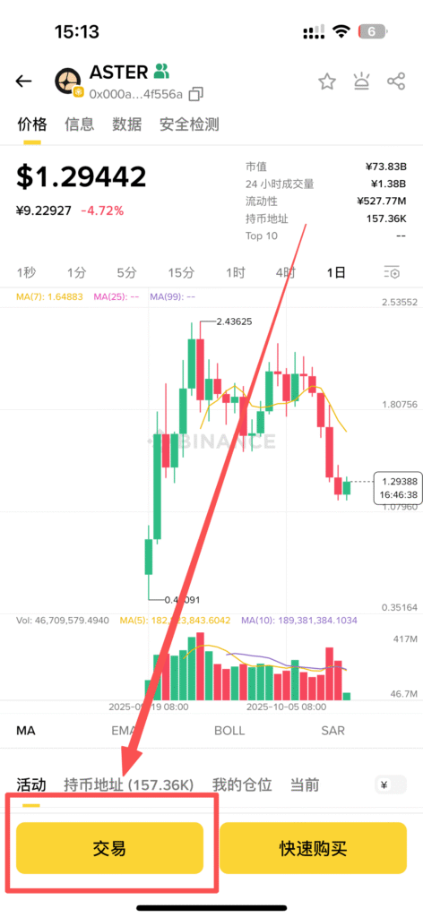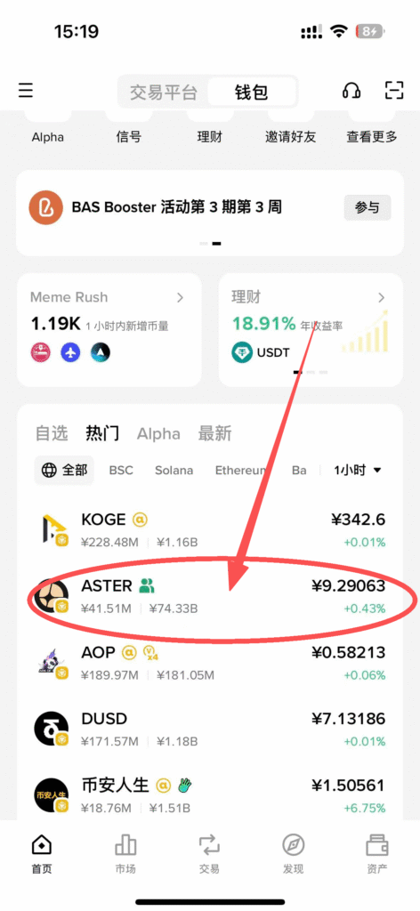 我以币安钱包,购买Aster代币为例,其他钱包例如OKX钱包,GMGN平台都大差不差
