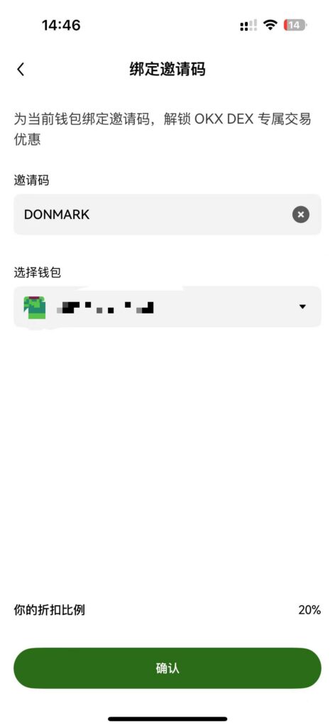 第四步、输入邀请码 DONMARK,确认绑定,即可获得20%的手续费减免,或者如果您会魔法上网的的话点击这个链接直接跳转绑定:https://web3.okx.com/join/DONMARK
