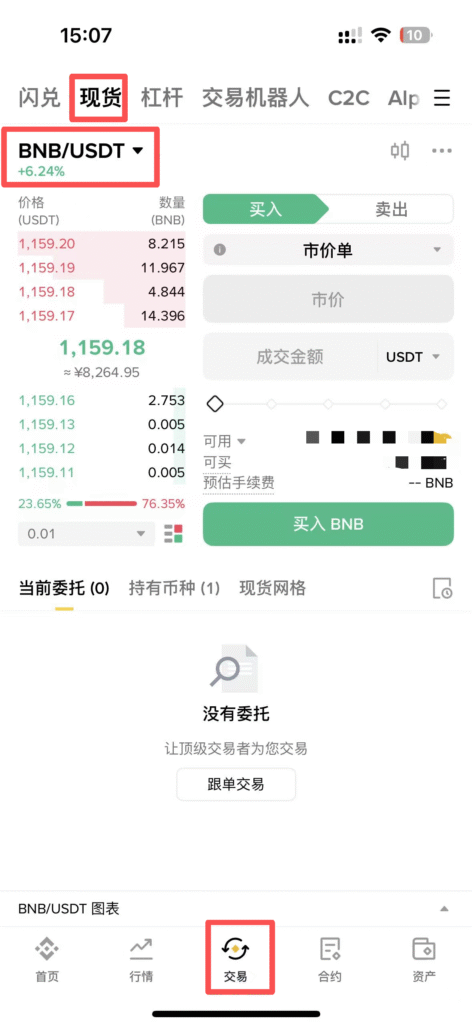 以币安平台为例,如果你想操作BSC链上的代币,需要购买BNB现货提现到你的钱包里面