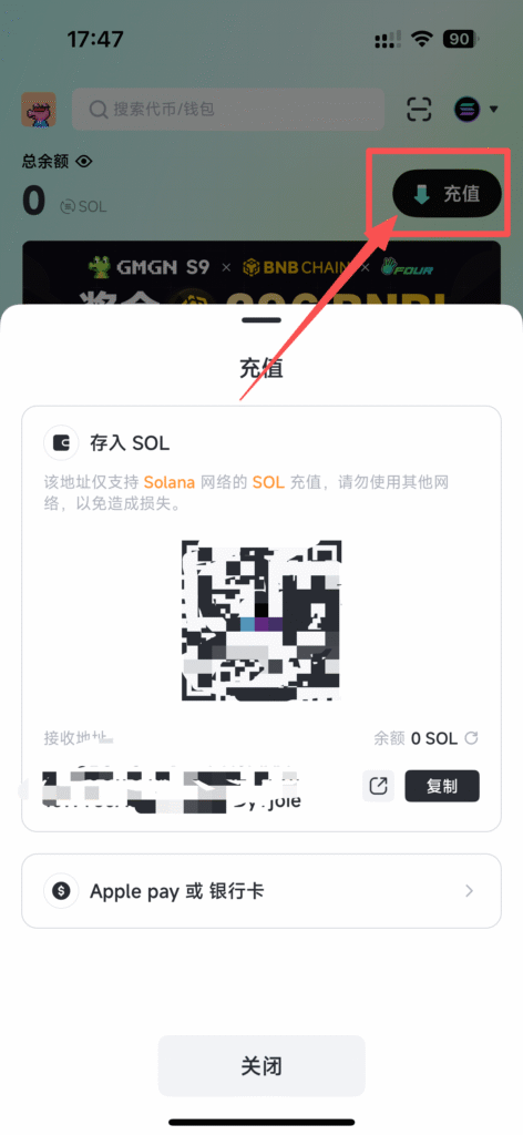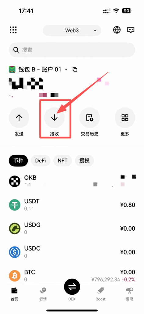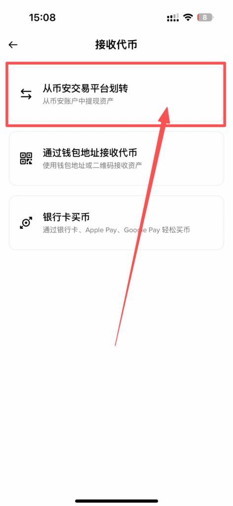 切换到币安钱包,点击接收,从币安交易所内转入,提现到你的钱包即可